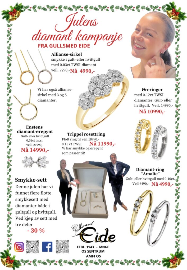 I over 80 år har Gullsmed Eide levert gullsmedvarer til lokalsamfunnet. I våre to butikker på Os føres et rikt vareutvalg, med stadig skiftende utstillinger. Firmaet drives nå videre av andre og tredje generasjon gullsmeder. På sidene her vises dagens aktuelle varer fra våre leverandører og fra eget verksted. Se mer under menyen. Viser først julens diamant-kampanje med nye og aktuelle smykker til kjempegode priser: