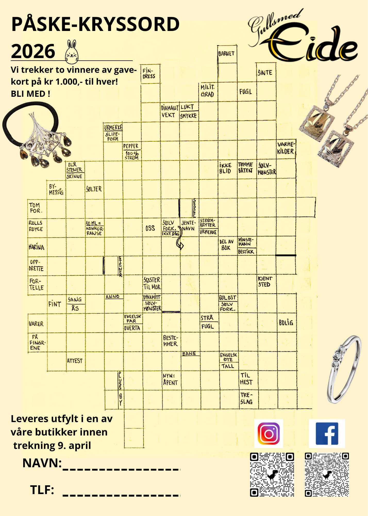 Vi nærmer oss påske, og tradisjonen tro har vi også i år laget et påske-kryssord. Det er gavekort som premier. Det kan enten hentes i en av butikkene våre, eller printes ut fra hjemmesiden vår. Innlevering i butikken senest 9. april. Lykke til og god påske!
